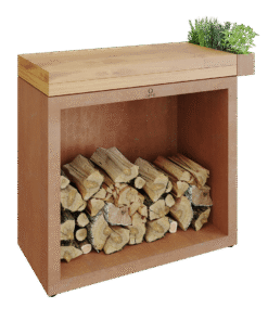 Arbetsbord i fyra olika utföranden där alla har en massiv arbetsskiva i gummiträ samt ett praktiskt flaskställ för tillbehör. 3 modeller har även vedförvaring.
