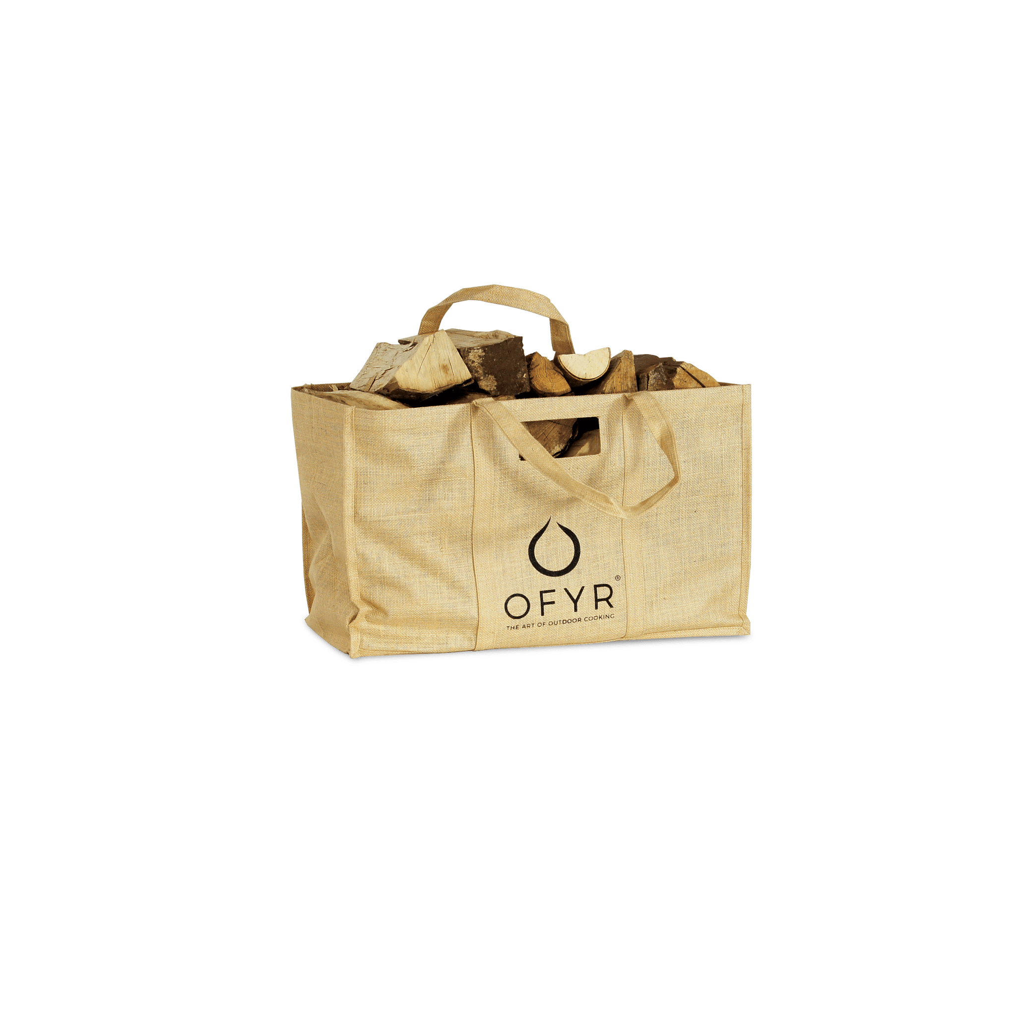 Bagen som är gjord för att praktiskt kunna bära med sig flera vedträn från förvaringen till Ofyren.