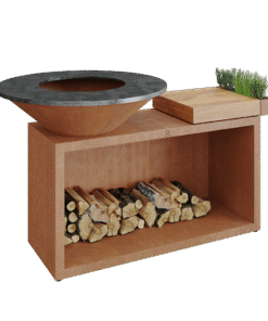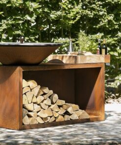 Denna kombimodell har en oslagbar stil och funktionalitet i en kompakt design. Tillverkat av slitstarkt cortenstål. Modellen har vedförvaring och skärbräda i teak samt ett praktiskt flaskställ för tillbehör.