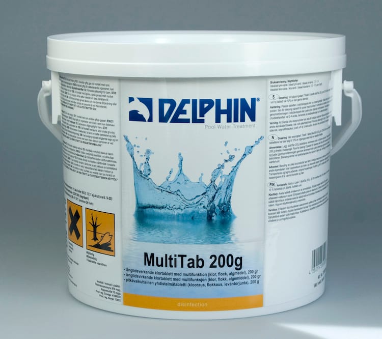 Multiklor. Innehåller klor, pH-stabilitator, algmedel och flockningsmedel.