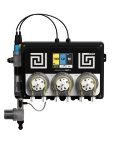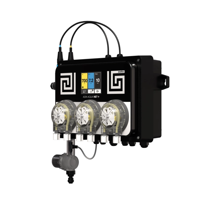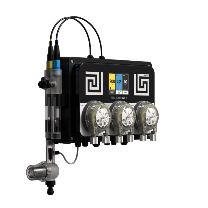 Nya ASIN AQUA Net+ kontrollerar poolvattnet och doserar kemikalier vid behov. Med sin tredje doserpump kan ASIN AQUA Net+ även dosera flockningsmedel eller